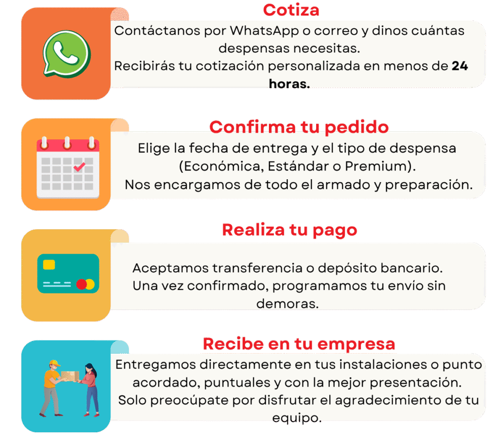 Por eso trabajamos con las mejores marcas, seleccionadas con cuidado para ofrecer despensas que tus colaboradores realmente disfrutan y recuerdan con gratitud. Cada artículo representa tu aprecio y compromiso, porque sabemos que detrás de cada despensa hay una historia de esfuerzo, trabajo y unión.